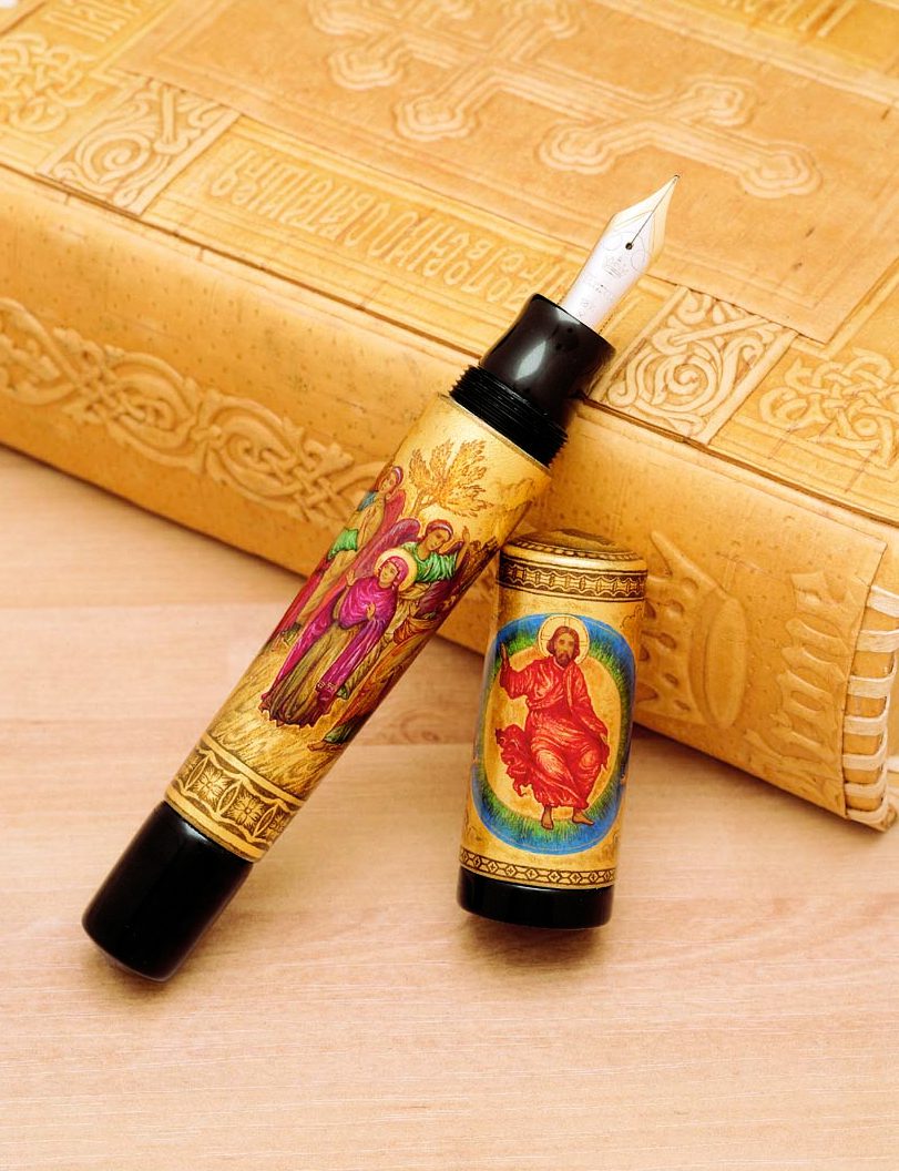 Each pen is accompanied by a hand made box from the bark of a birch tree. Inscribed it reads, “By the blessing of Saint Patriarch of Moscow and all Russia Alexia II. Bible.” This saying means that this bible cover has been blessed by the Head of the Orthodox Church of Moscow and all of Russia.