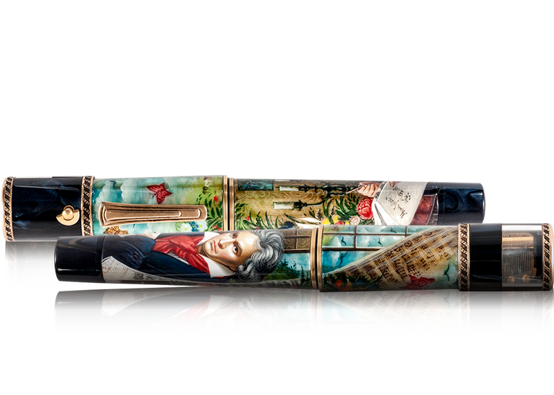 Beethoven Pen CapKrone pays tribute to the musical genius of Ludwig Van Beethoven with a finely crafted writing instrument. The delicately hand-painted mother of pearl cap and barrel capture the essence of Beethoven.