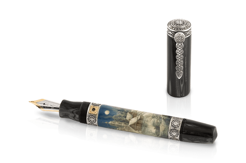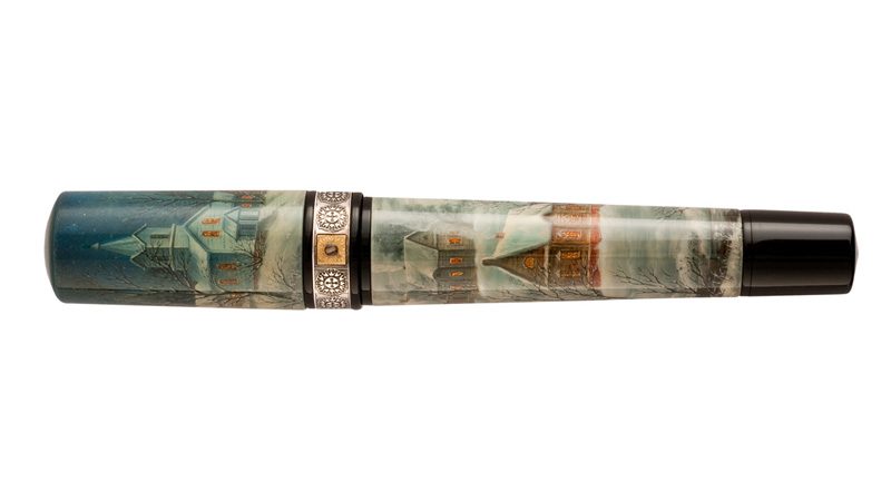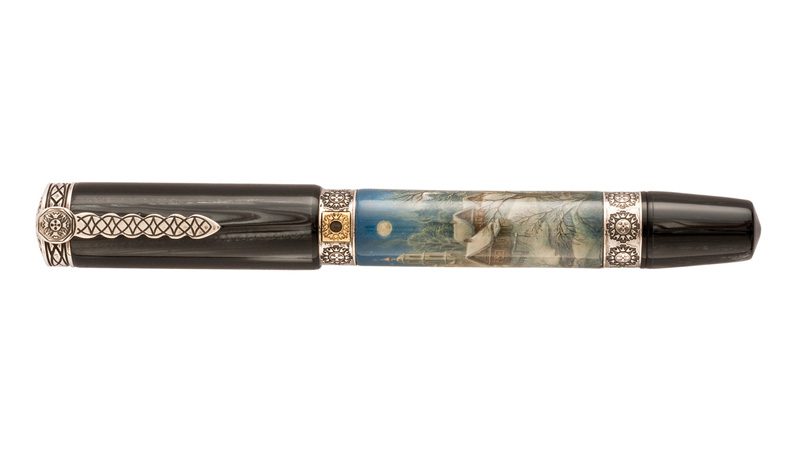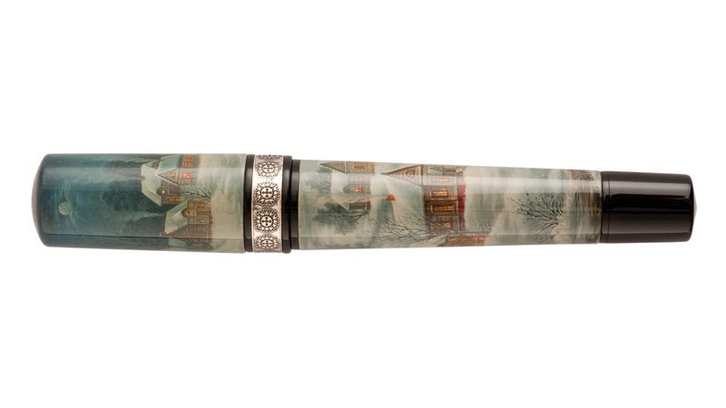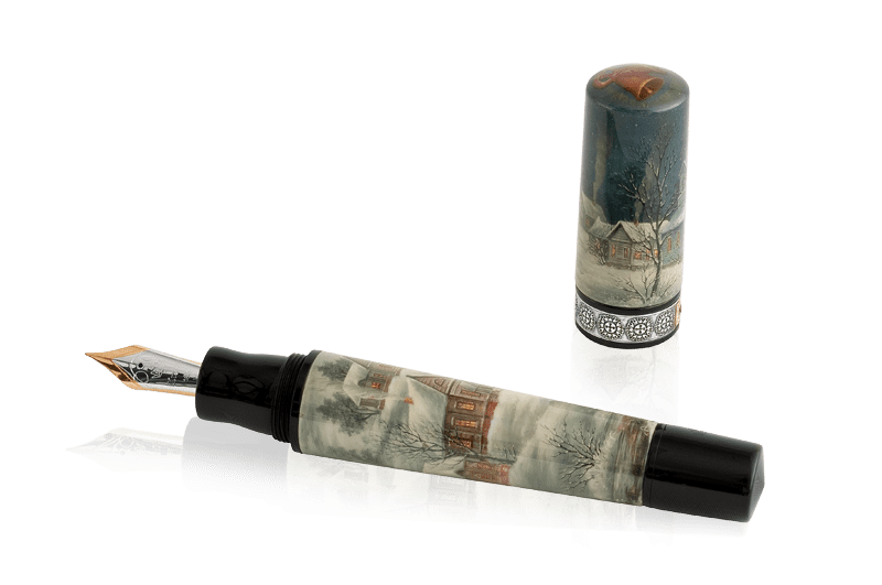 The Krone Limited Edition Charles Dickens fountain pen celebrates this man’s incredible accomplishments. Surrounded by elegant charcoal celluloid casing, the pen features a magnificent Dickensian winter scene, hand-painted on mother of pearl, which seems to be taken right out of Dickens’ creative imagination.