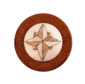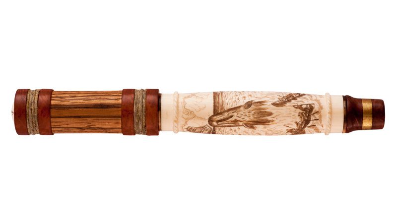 The cap is made with African Zebra wood panels framed by Briarwood. Trimming the top and bottom of the cap there are hand-wrapped insets of antiqued twine, simulating a ship’s rigging. On the top of the cap, set into the Briarwood, is a Mammoth Ivory disk with a Compass Rose done in scrimshaw. The blind cap has a bronze band with Herman Melville’s signature deeply engraved.