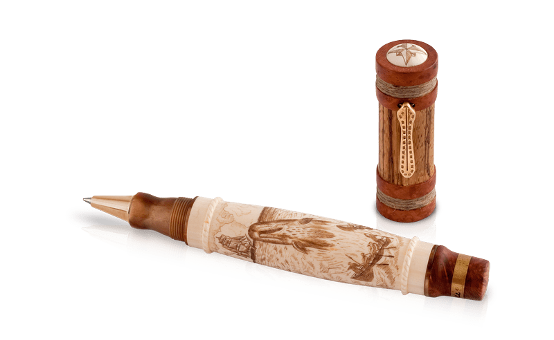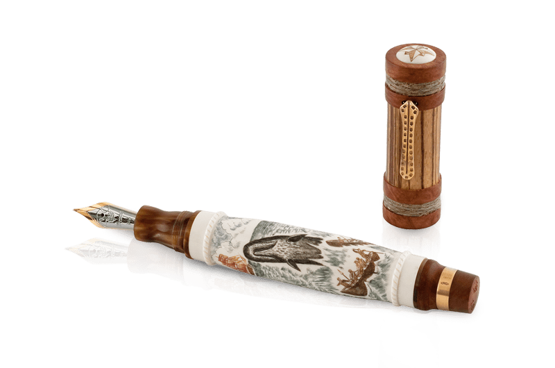 Krone honors the writing of Herman Melville’s Moby Dick with a stunning writing instrument. The barrel is Mammoth Ivory, which is at least 10,000 years old. The rich, delicate, sepia-colored scrimshaw artwork is a portrait of Herman Melville as well as a scene from the Moby Dick story.