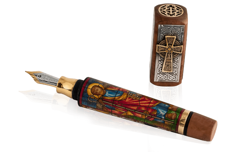 St Patrick Fountain Pen CapKrone honors Saint Patrick with a magnificent pen. The barrel is a luminescent, brilliantly colored painting over a hand-made barrel; re-creating the glowing stained glass of that time period. The image is of Saint Patrick dressed as a Shepherd.