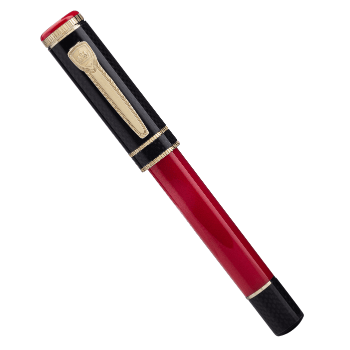 The Turbo pen stands out with its bold crimson barrel paired with a carbon-fiber accented cap and warm gold detailing that gives it a powerful, performance-driven presence. Its sleek profile and precision craftsmanship make it an eye-catching luxury writing instrument for collectors who appreciate dynamic style and exceptional build quality.